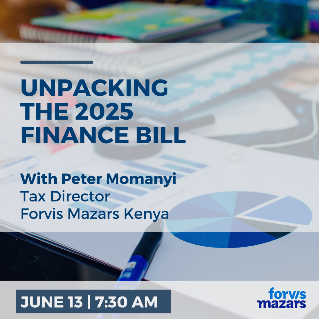 During the event, expert speaker Peter Momanyi, Tax Director at Forvis Mazars Kenya, will unpack the recently released Finance Bill 2025 and analyze its potential impact on businesses.