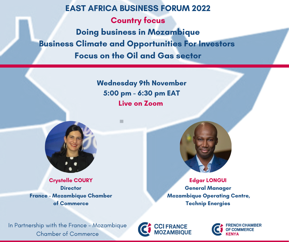 In the context of the East Africa Business Forum, the French Chamber of Commerce in Kenya is pleased to invite you to a country focus webinar on 'Doing Business in Mozambique'.