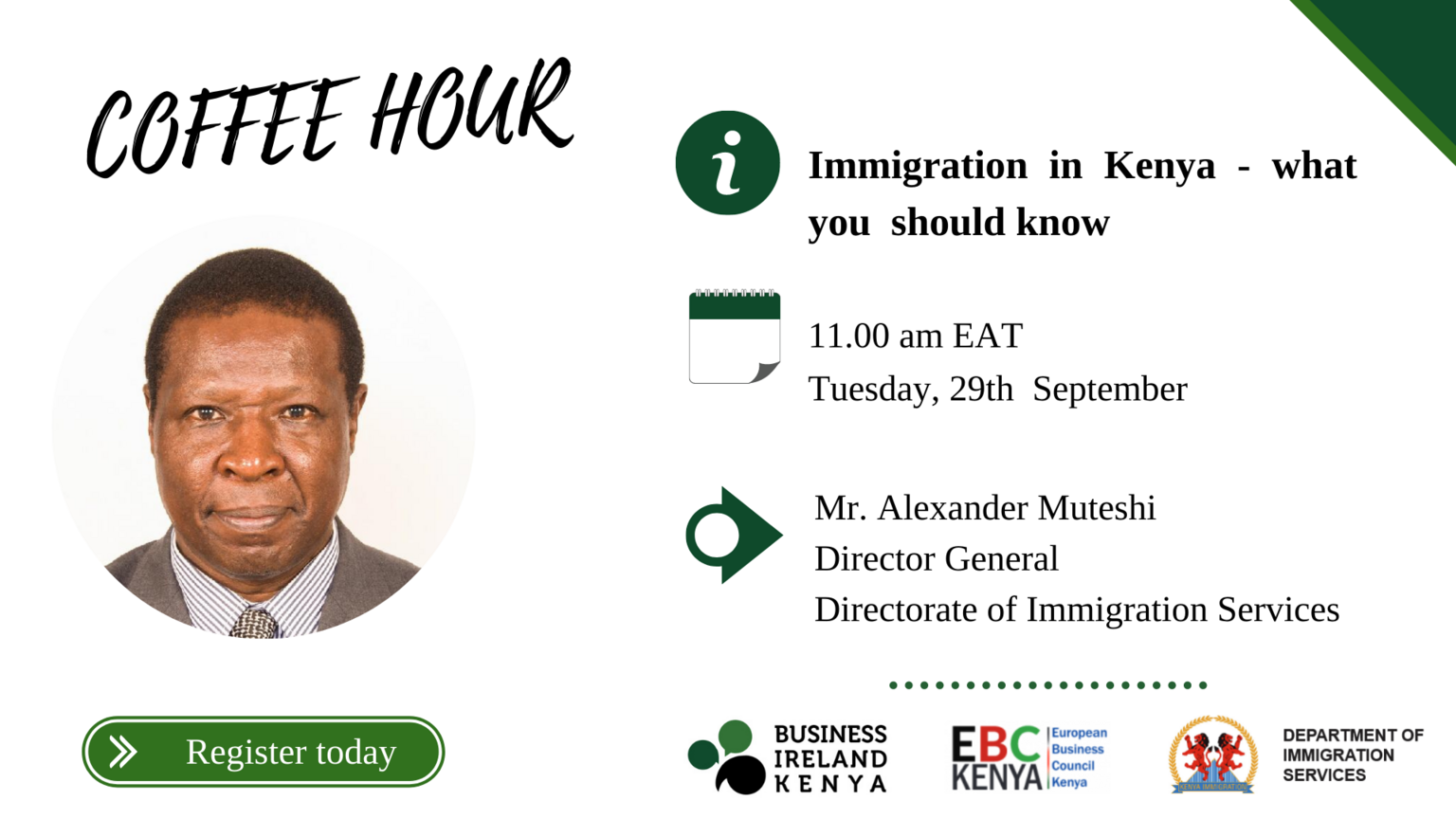 The French chamber is pleased to extend to its members and network; the European Business Council and Business Ireland Kenya's upcoming webinar invitation. Don't miss the opportunity to benefit from  Mr. Alexander Muteshi -the Director General, Directorate of Immigration services expertise as we discuss: 'Immigration in Kenya - what you should know'