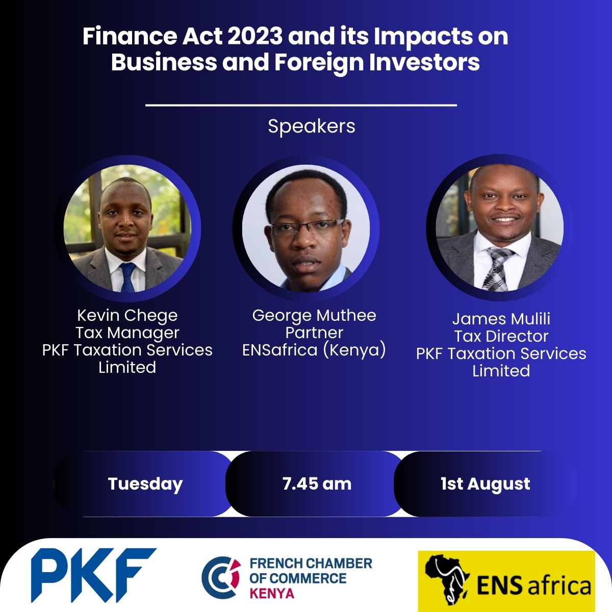 Our speakers from PKF Kenya LLP will be: Kevin Chege, Tax Manager and James Mulili, Tax Director. Also presenting will be George Muthee, Partner at ENSafrica (Kenya)