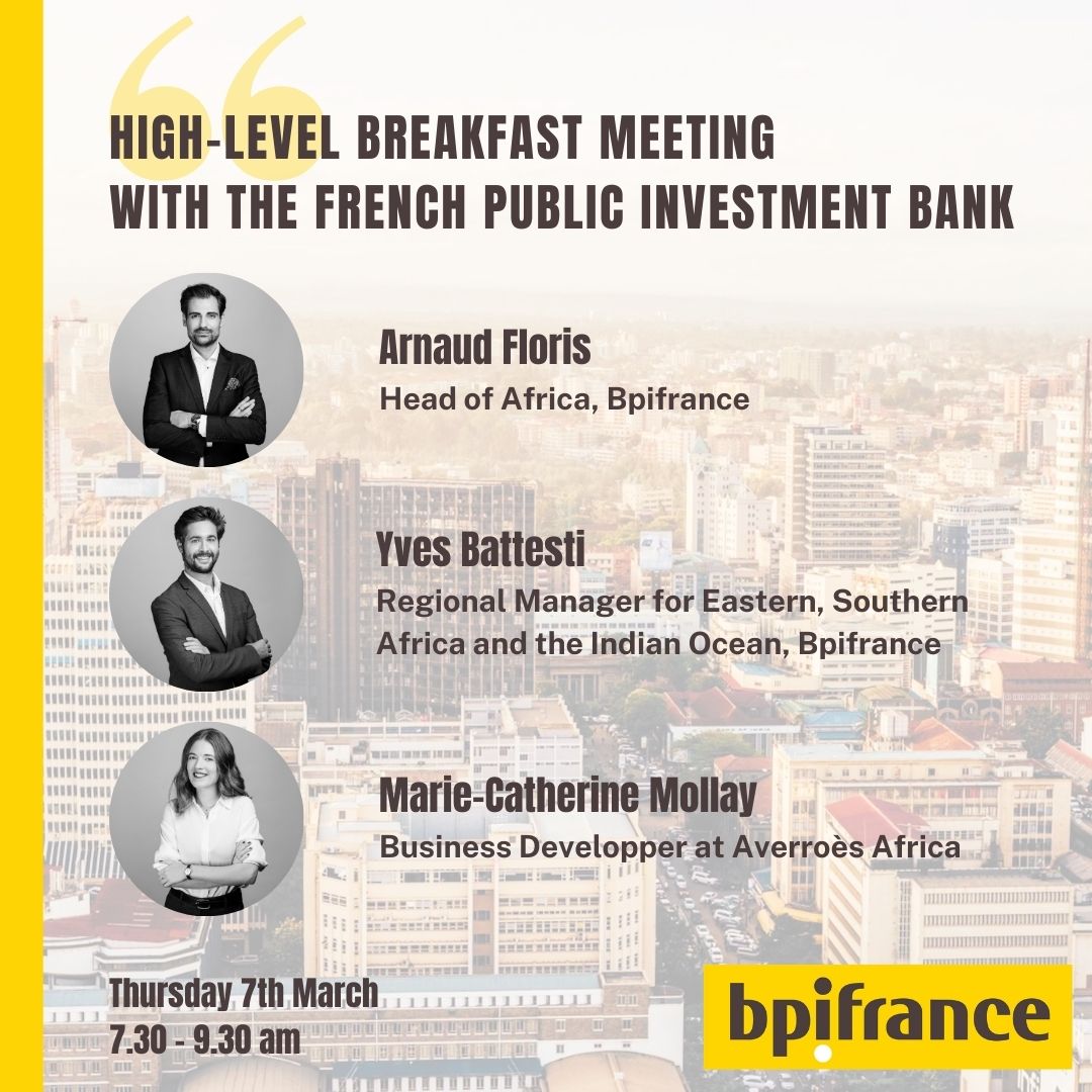 This event is a great opportunity for C-level Executives to meet and interact with Arnaud Floris, Head of Africa at Bpifrance, Yves Battesti, the new Regional Manager for Eastern, Southern Africa and the Indian Ocean, based in Nairobi, and Marie-Catherine Mollay, Business Developer at Averroès Africa - African Funds of Funds.