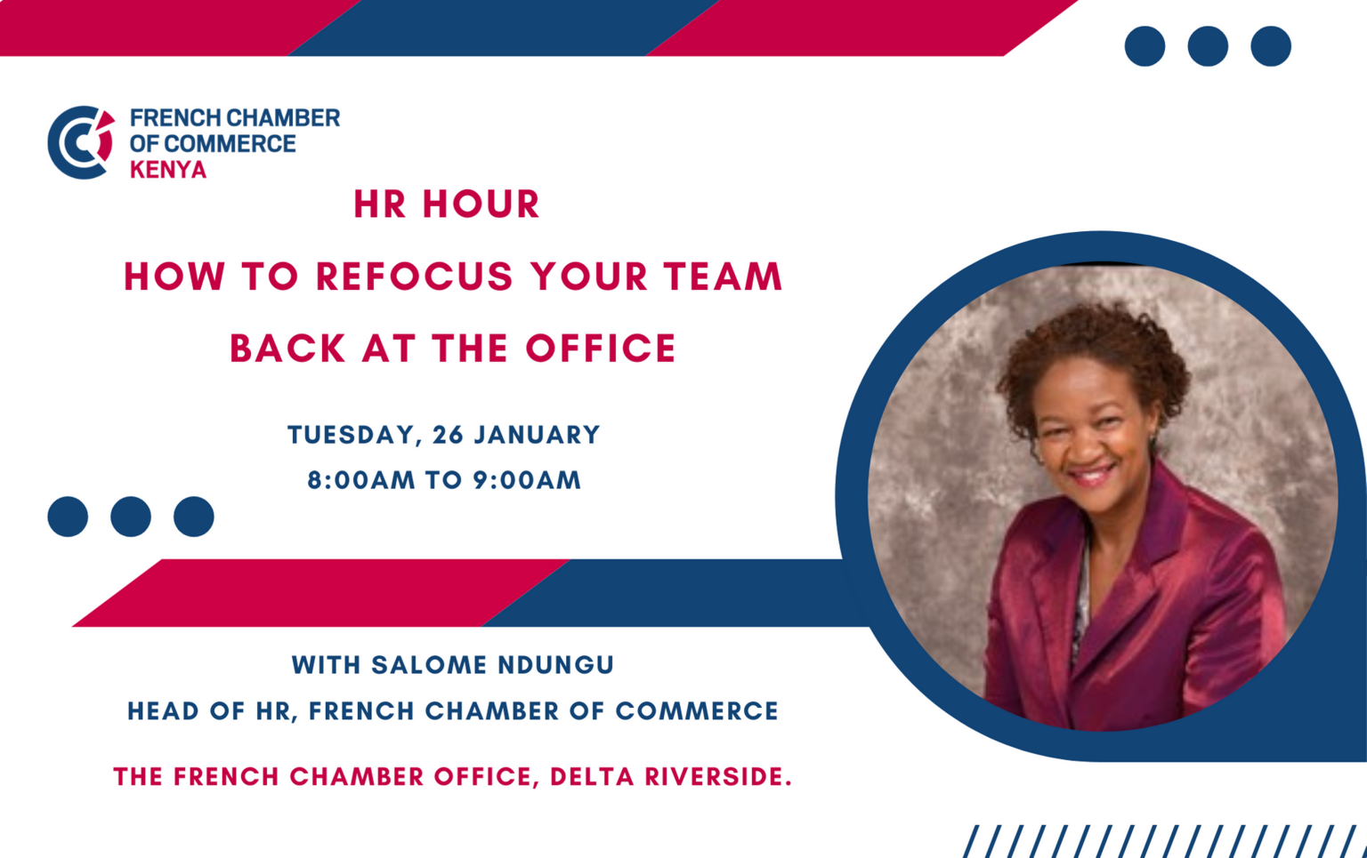 During the event, Salome Ndungu, Head of HR, French Chamber of Commerce will share insights on how you can successfully have your team embrace working at the office once again after months of remote working.