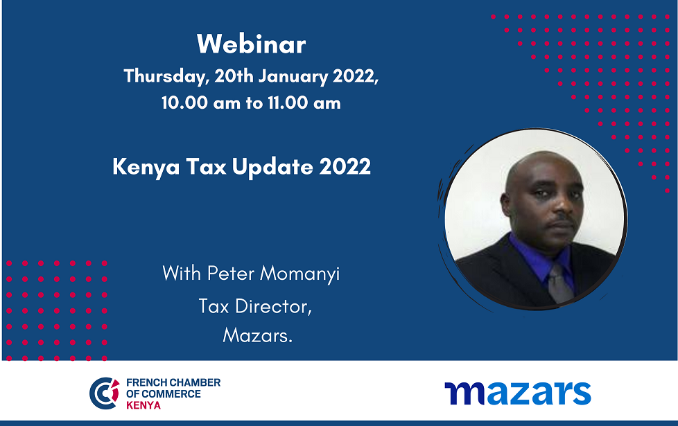 The event will be led by Peter Momanyi, Tax Director at Mazars. Peter will share insights on the changes and the new requirements that your company should be aware of in regards to Tax in Kenya as well as areas that could impact foreign companies.