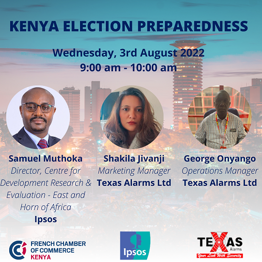During the webinar; Samuel Muthoka, Director, centre for Development Research & Evaluation East and Horn of Africa at Ipsos, Shakila Jivanji, Marketing Manager at Texas Alarms Ltd and George Onyango,Operations Manager at Texas Alarms Ltd will unpack what the elections mean to your business and the country at large.