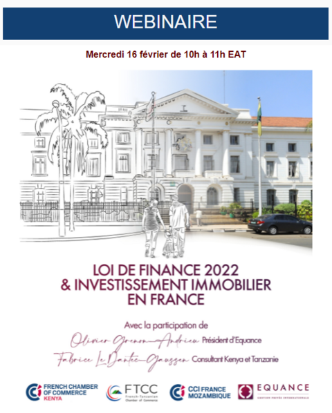Depuis 2005, Equance conseille les non-résidents.Son réseau de Consultants en Gestion de Patrimoine est réparti dans plus de 50 pays pour accompagner les Français de l’étranger dans l’organisation et la transmission de leur patrimoine : gestion privée, gestion d’actifs, placements, prévoyance-santé... Ce wébinaire sera animé par M. Fabrice Le Dantec-Gaussen, consultant au Kenya et en Afrique de l’Est, avec la participation de M. Olivier Grenon-Andrieu, président du groupe Equance.