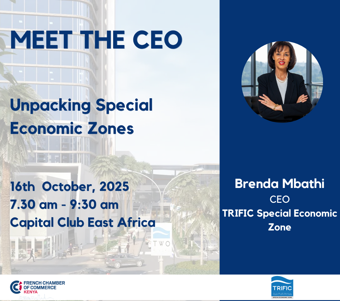 The French Chamber of Commerce is delighted to invite you to our upcoming "Meet the CEO" Breakfast Meeting featuring Brenda Mbathi, Chief Executive Officer, Two Rivers International Finance & Innovation Centre (TRIFIC SEZ).