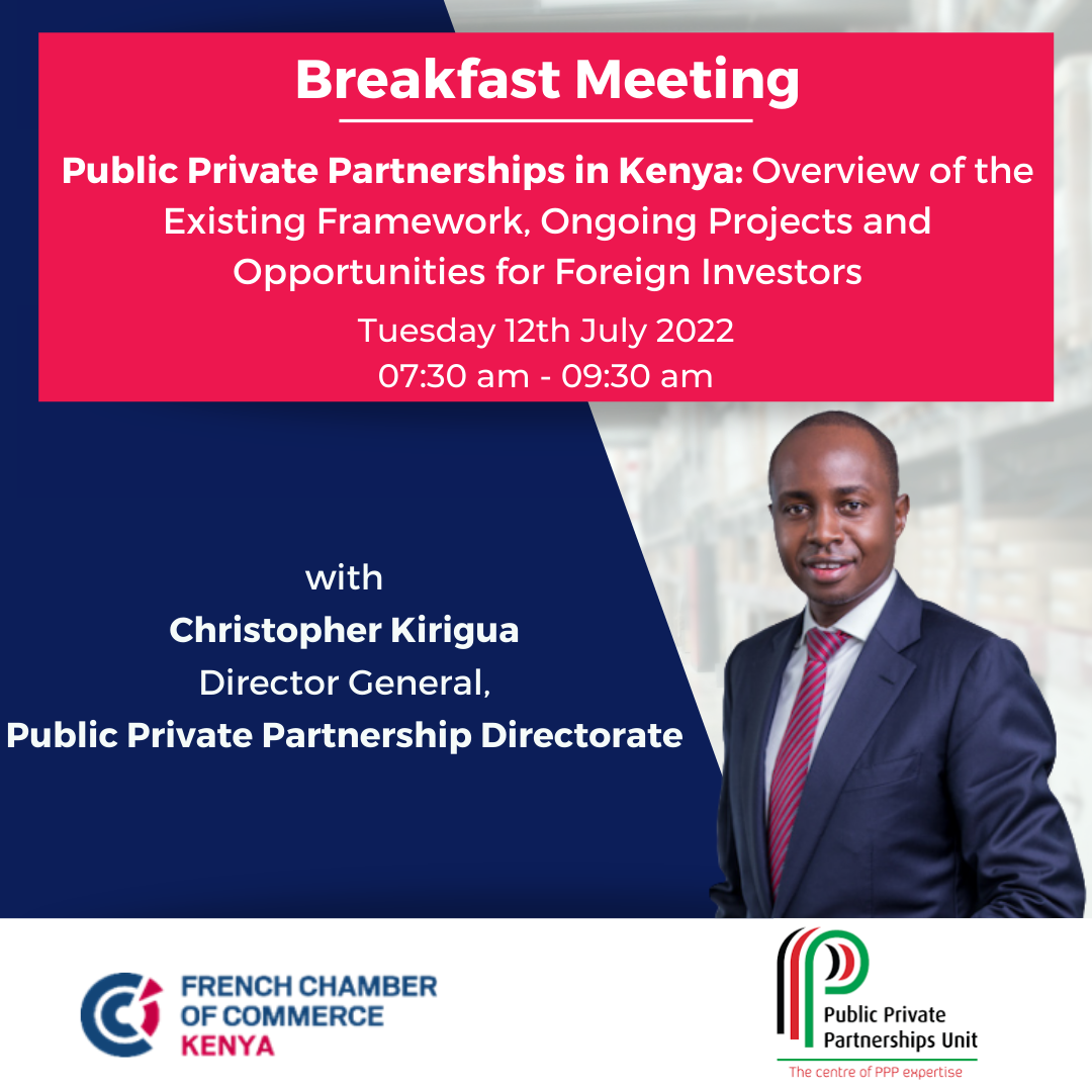 The French Chamber is pleased to invite you to a breakfast meeting with the Public Private Partnership Directorate (PPP) on Tuesday 12th July from 7:30 a.m. at Villa Rosa Kempinski, Westlands.