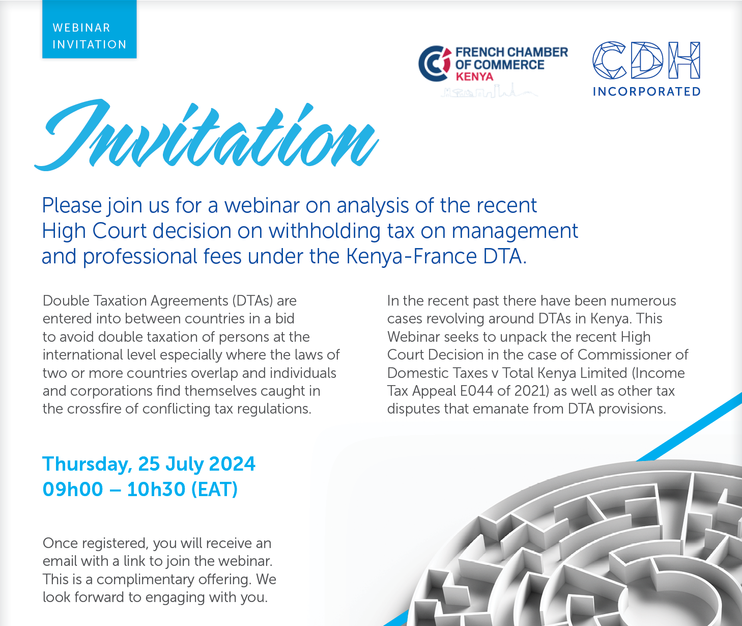 The French Chamber is pleased to invite you to a webinar as we discuss the recent analysis of the High Court decision on withholding tax on management and professional fees under the Kenya - France DTA in partnership with our member, CDH Kenya.
