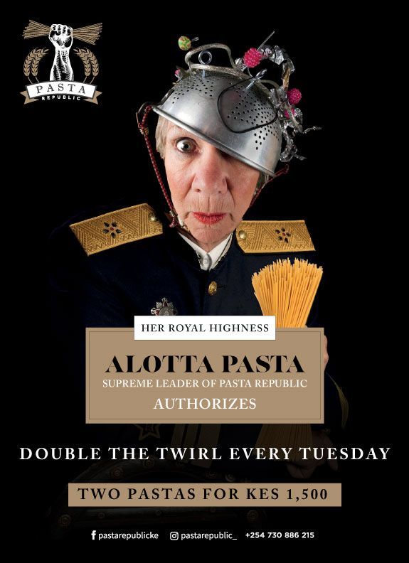 Two Pastas at 1500/= every Tuesday.