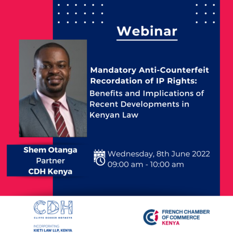 On Wednesday, we were happy to organize a webinar on the implications of recent development of the Anti-Counterfeit Recordation of Intellectual Property Rights. Our members, CDH's Shem Otanga, partnered with a speaker from the ACA, Casper Oluoch to reveal several new provisions to this ongoing legislation, notably, the new recordation requirements, certifications and powers the ACA will obtain.