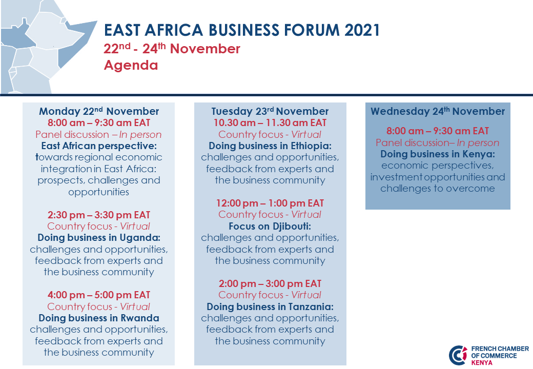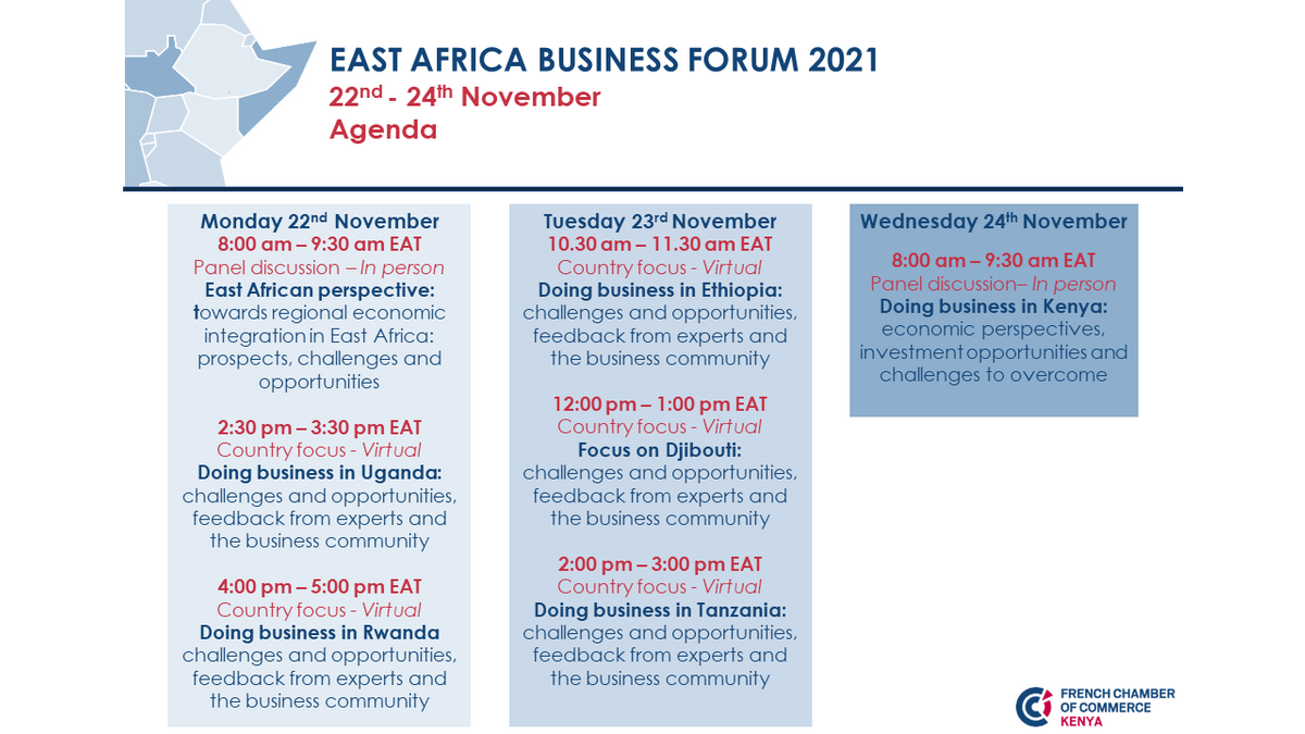 This three-day business forum will feature 2 in-person panel discussions that will take place in Nairobi and 5 country focus webinars. The countries that will be covered this year are: Kenya, Rwanda, Tanzania, Uganda, Ethiopia and Djibouti
