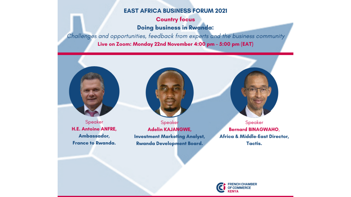 In the backdrop of the East Africa Business Forum 2021, we held a session on Doing business in Rwanda'. The session was led by H.E. Antoine ANFRE, Ambassador, France to Rwanda; Adelin KAJANGWE, Investment Marketing Analyst, Rwanda Development Board and Bernard BINAGWAHO, Africa & Middle-East Director, Tactis.