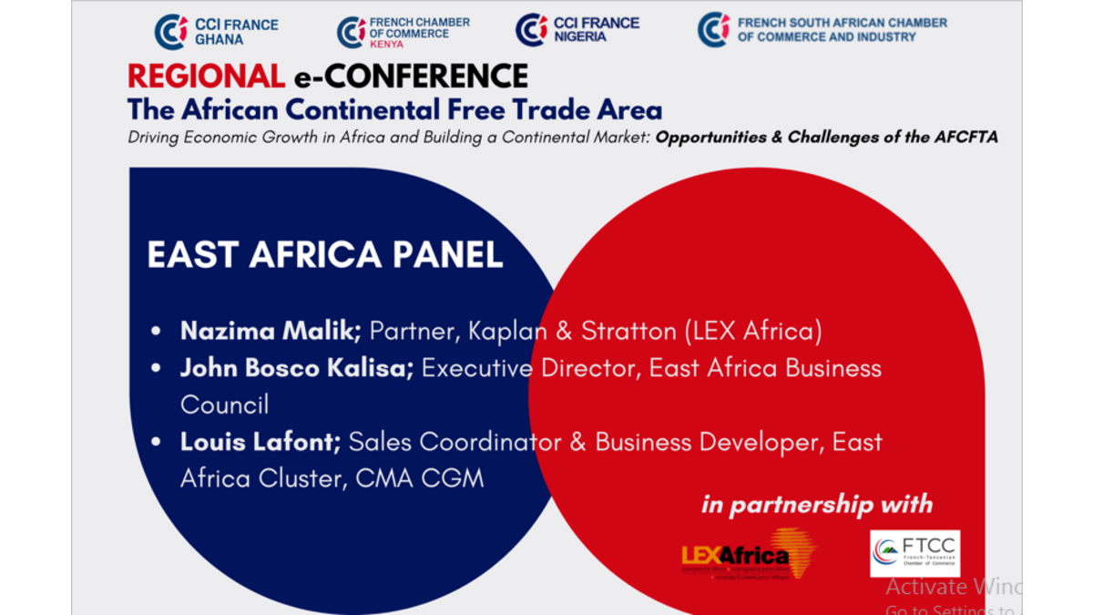 During the East Africa session of AfCFTA Regional e-conference, Our regional experts Mrs. Nazima Malik, Partner at Kaplan & Stratton (LEX Africa), Mr. John Bosco Kalisa, Executive Director of the East Africa Business Council, Louis Lafont, Sales Coordinator & Business Developer, East Africa Cluster, CMA CGM unpacked the business opportunities unlocked by the AfCFTA and its legal/tax implications in the context of the East African Region among other topics.