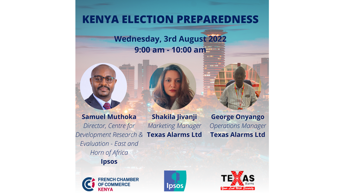 On Wednesday 3rd August we hosted a webinar on Kenya Election Preparedness, with presentations from our members Ipsos and Texas Alarms Limited. Samuel Muthoka, Ipsos Director of East and Horn of Africa, took the participants through the factors that have contributed to the shaping of the upcoming elections from the public's perspective; factors such as media reach and the economic situation of the citizens. He also shared findings from their latest research surveys, giving sample sentiments of the public in terms of candidate preferences and pertinent issues in the minds of the people. Texas Alarms, presented by Shakila Jivanji and George Onyango, Marketing and Operations Managers respectively, gave an overview of security in Kenya during the elections period. George also gave directives and key pointers on safety and emergency during the civic duty season. We thank Ipsos and Texas Alarms for the presentation and all our members in attendance.