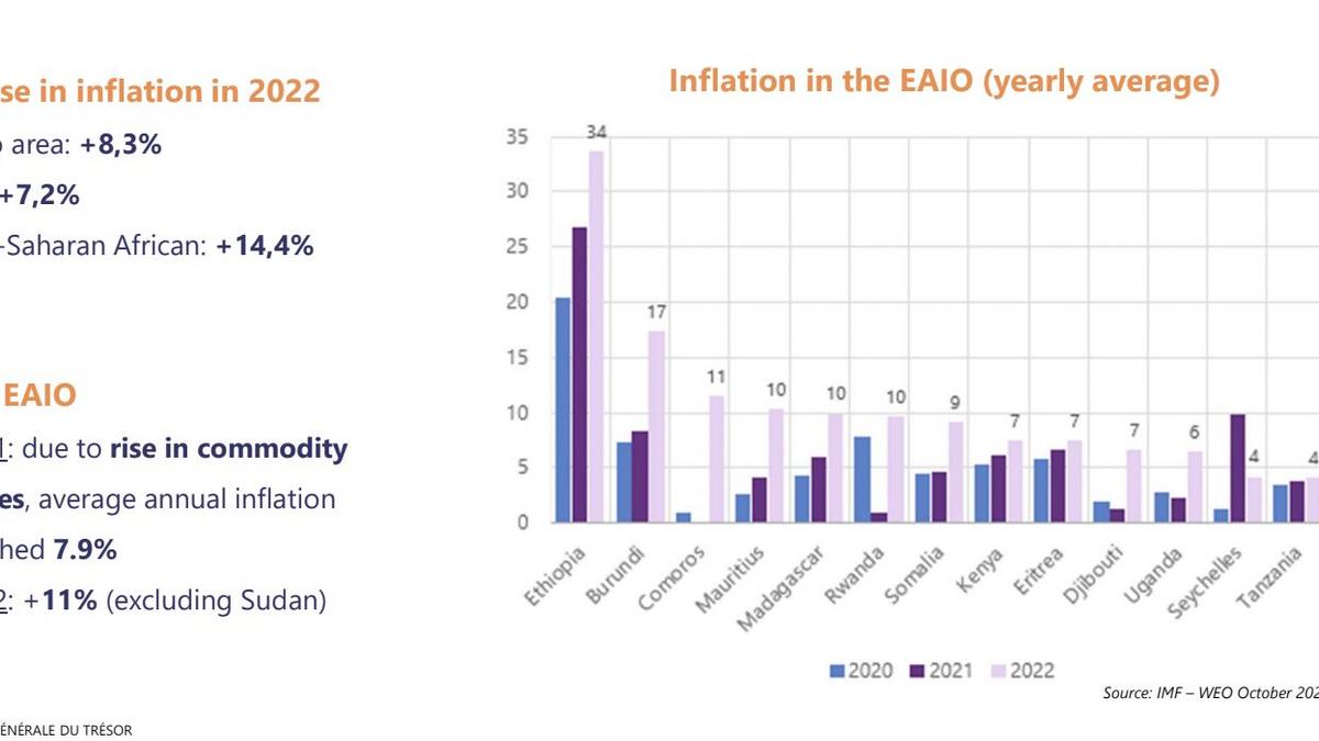 After an average inflation rate of 12.4% between 2010 and 2019, the rise in inflation in 2022 in all East Africa & Indian Ocean countries, following the Covid-19 crisis and the war in Ukraine, has tested the capacity of countries in the region to respond to external shocks. Rising international prices for food, energy and fertilizers have resulted in imported inflation, which monetary policy has little control over. Depending on the level of development of the country, the domestic market and the financial sector, and on the exchange rate regime, the central banks in the region employed different strategies to counter the inflation. Transmission of monetary policies to the real economy remains however constrained by structural factors and limited access to forex reserves.
