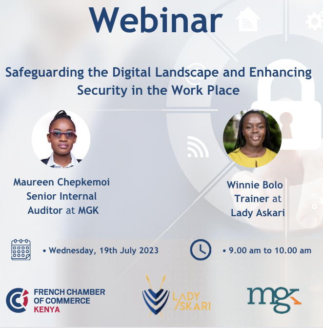 The second half of this webinar was a session on focused on physical security at the work place. What do you do in the event of an active shooter or terrorist attack whose intention is to cause harm and kill as many people as possible? Have you found yourself scanning new surroundings for the nearest exit just so you are ready in case of danger? Winnie Bolo, Trainer at Lady Askari, our silver member advised us to run if there is an accessible escape path or hide if the former is not possible. Where both these fail, fighting is a measure of last resort.